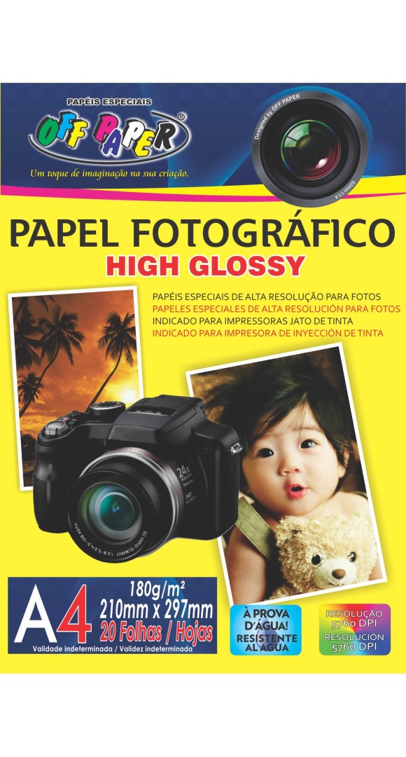 - Papel Fotográfico High Glossy A4 20 Folhas - Papel especial de alto brilho (glossy). - Alta resolução para impressão de fotografias. - Indicado para impressoras Jato de Tinta. - Formato: A4 - Embalagem: 20 Folhas - Gramatura: 180 g/m2 - Resolução: 5.760 DPI