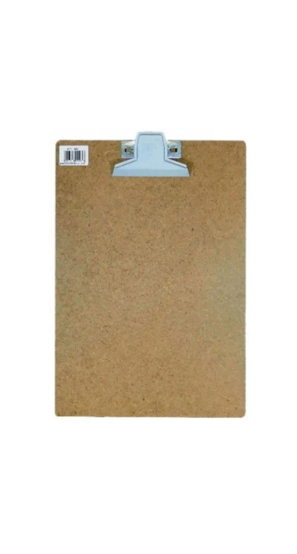 • Prancheta em chapa de Eucatex com pegador de metal em chapa de ferro galvanizado. Disponível nos tamanhos ofício (344x230 mm)